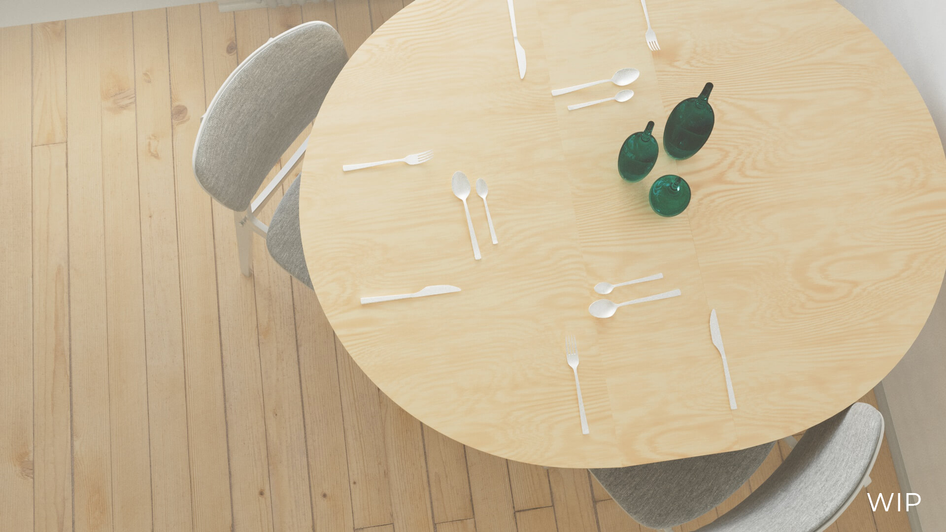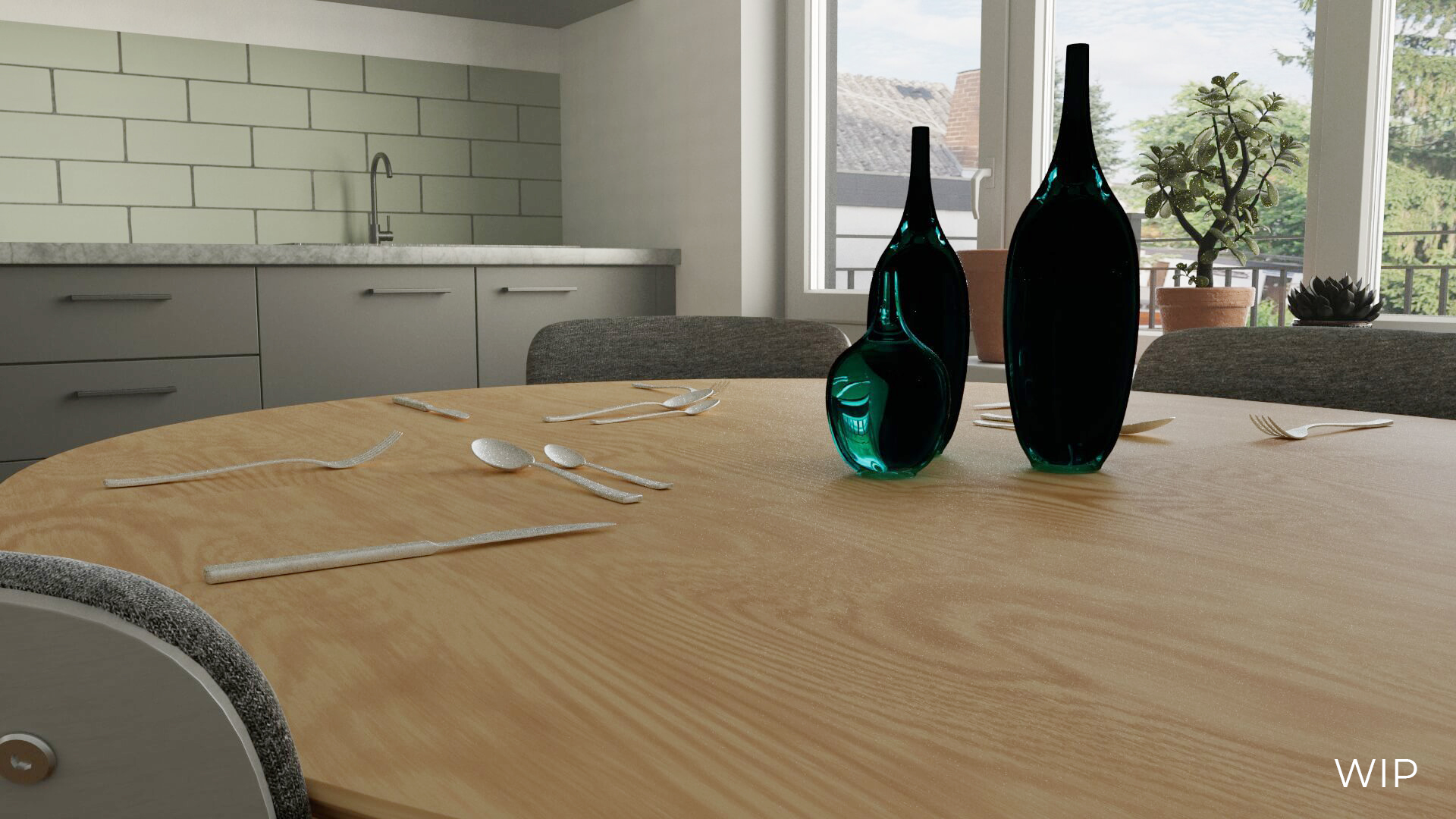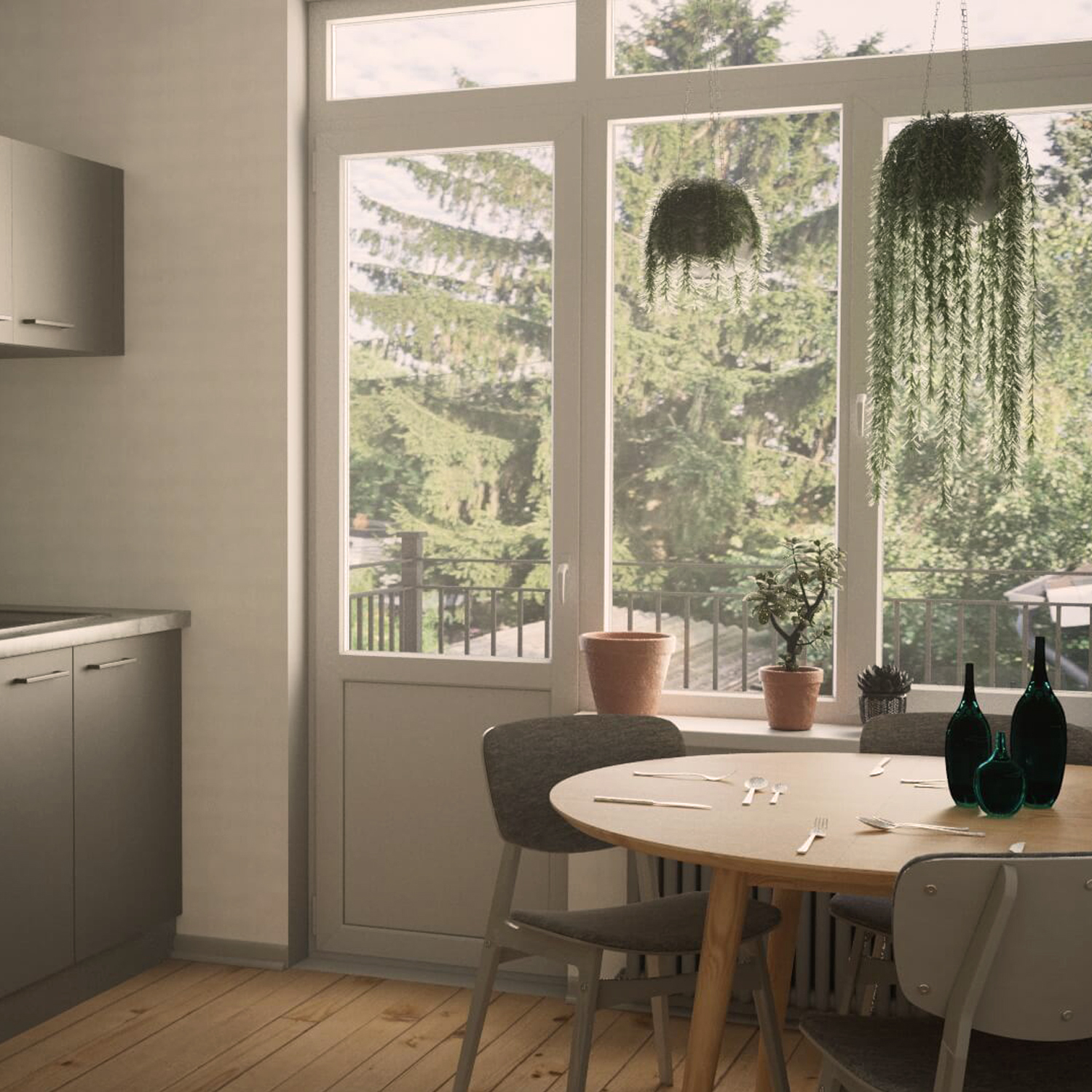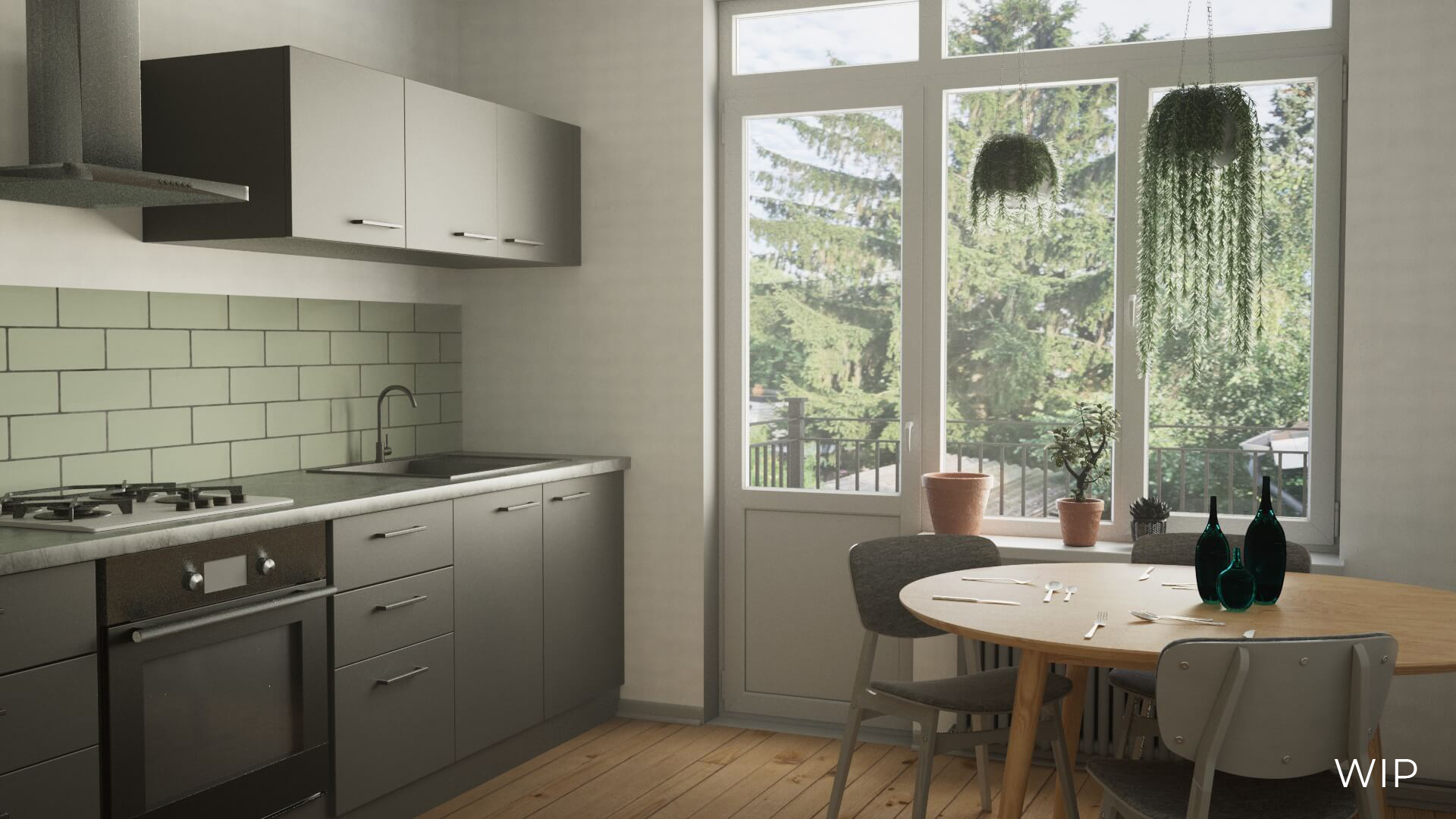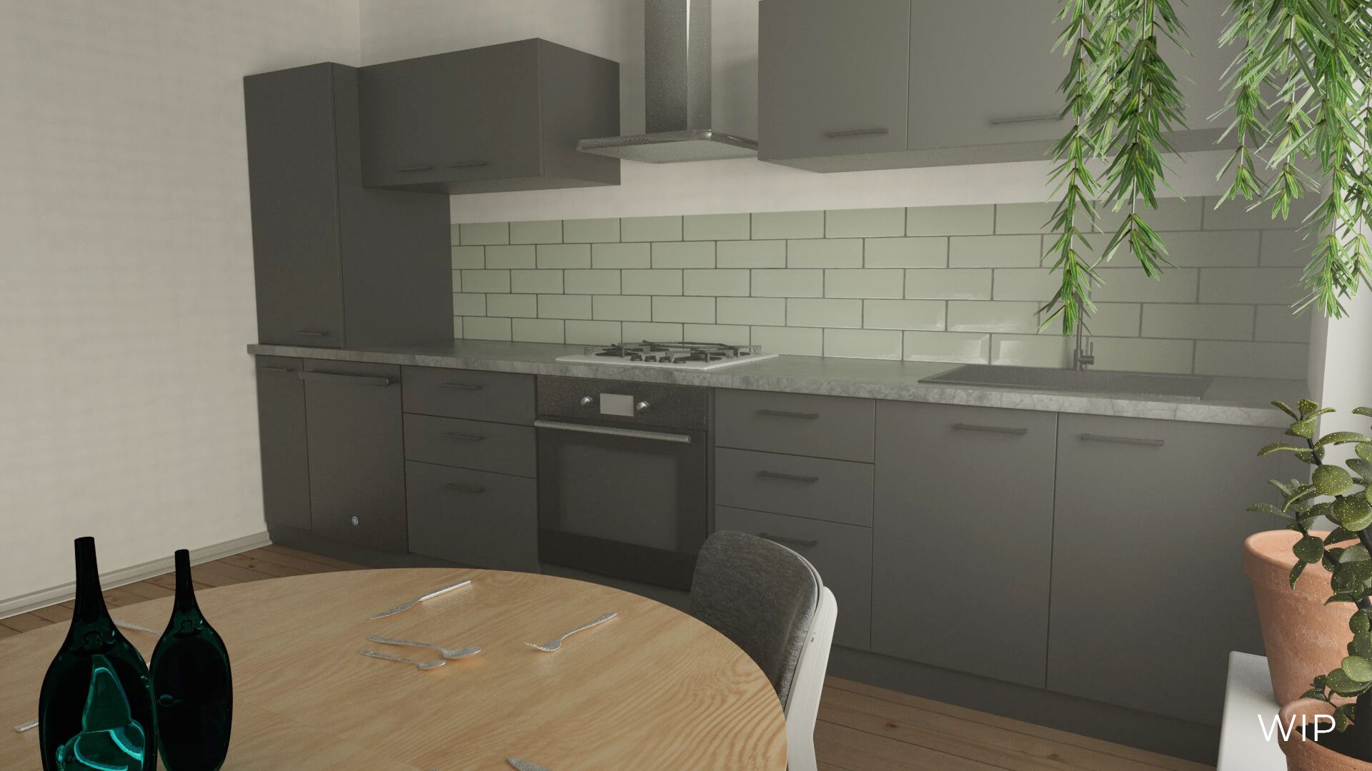 Eine modern eingerichtete Küche mit Elementen im skandinavischen Stil. Bearbeitet und gerendert in Cinema4D mit Redshift Renderer.
